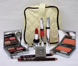 Set comes packaged in a re-useable quilted and zippered cosmetics bag in white with chocolate piping and a snap closure tab.